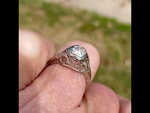 Beautiful and exquisite antique Art Deco .45 ct diamond solitaire engagement ring hand crafted in 18K white gold. An open work hexagonal engraved frame holds the .45 carat sparkling diamond with the ring set off the finger in a detailed filigree mounting that cascades down the shoulders.